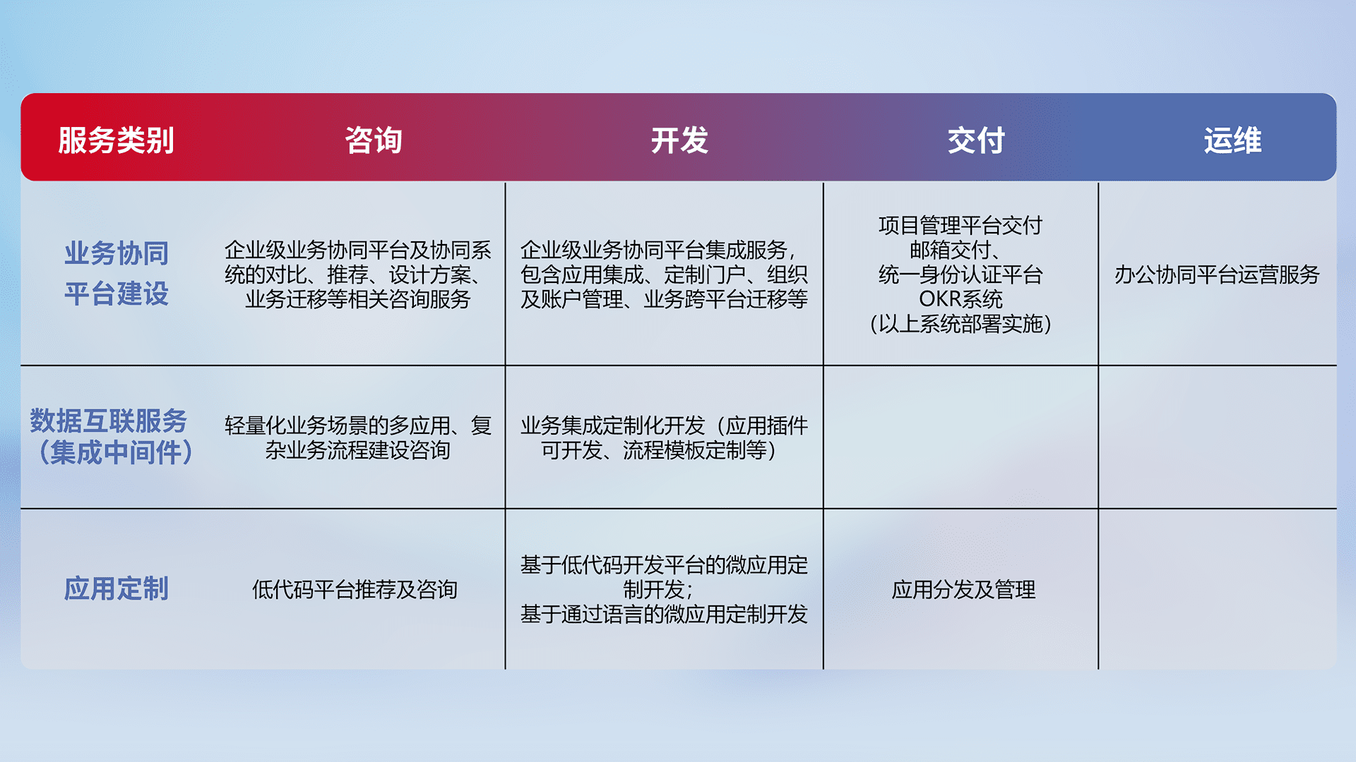 针对钉钉、、、、企微、、、、IDaas等平台级产品提供产品的规划、、方案、、、、交付、、定制化开发等服务,,,,实现如统一协同办公、、、、智能客户服务、、、混合会议管理、、智能数据查询、、、等业务场景,,,实现数字化转型。。。。